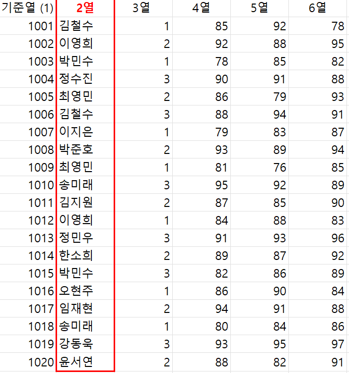 나머지는 위와 같고 열번호만 4로 바뀌었습니다. 국어점수가 기준열에서 4번째에 위치하고 있기 때문입니다.